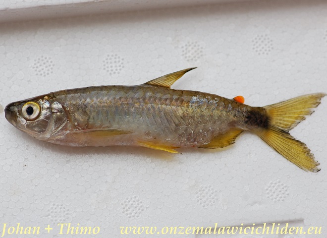Brycinus imberi lives in small schools in the shallow waters of sheltered, muddy bays. They can be found not only in Lake Malawi but also throughout the whole southeastern part of Africa. The females of this species become bigger than the males and grow to about 13 cm while the males become not bigger than 11 cm. They are omnivores and they will be very easy to keep in an aquarium provided that they, of course, are offered for sale. As far as we know this species is so far not yet exported from Malawi for aquarium lovers. This example is caught in Tanzania for scientific purposes at the University of Antwerp. |