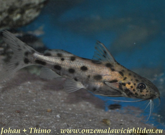 Synodontis nyassae can be found in entire Lake Malawi. During most time of the year they mainly are living there in the holes between the rocks. However, it seems that in autumn a lot of these species can be found above sandy and muddy bottoms with a low waterlevel. There are two varieties of this species, one with big spots on the body and one with smaller spots. They can reach a total lenght of about 20 cm. You can best keep these animals in a tank which is not too small, because of the size they reach, and with more of them together. (This is because they live in groups so then you will see them more in your aquarium.) These animals are living at night, in daytime they hide between the rocks. In general they are very tolerant against other inhabitants. Probably they are feeding themselves with insects, cancroids and other invertebrates. |