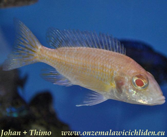 Aulonocara "sunshine" is a crossbreeding type from which are existing also differerent color variants, gained by crossbreeding for example Aulonocara sp."stuartgranti maleri" Chidunga with an albino type, or, like the species on this picture, crossbreeding of Aulonocara stuartgranti "Usisya" with an albino type. These Aulonocara variants are not living in Lake Malawi. The males of these species can grow to 12 cm when they get well fed in the aquarium, females stay a little smaller. Aulonocara "sunshine" is a quiet, peaceful cichlid which can be hold best with other quiet species, mbuna are generally too aggresive. In the aquarium they are comfortable with any food. They take everything they get offered, like spirulina pellets, mysis, artemia, cyclops and shrimp-peas mix.