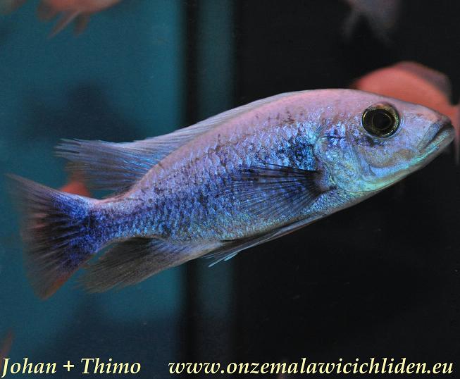 Sciaenochromis fryeri is a cichlid which is living all around Lake Malawi in all types of habitats as long as there are rocks in their environment. This colorvariant however is a breeding form of Sciaenochromis fryeri which is not living in the lake. In the lake the males of these species can grow to 16 cm, in the aquarium however they can grow taller because of a good feeding. The males can then grow to about 20 cm, females grow to about 14 cm. You can best keep this species with multiple females in a large tank with a lot of swimming space. These are inhabitants you can also keep together with all kinds of species, also mbunas. In the lake they are mainly feeding themselves with young mbunas. In the aquarium they are comfortable with any food. They take everything they get offered, like spirulina pellets, mysis, artemia, cyclops and shrimp-peas mix.
