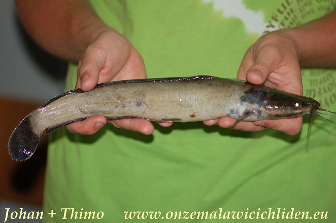 Clarias gariepinus lebt vor allem in sehr schlammigen Wasser von inländische Flüsse, die in Malawi-See fließen, manchmal sind sie im See in der Nähe dieser Flussmündungen zu finden. Sie werden nicht nur im Malawisee angetroffen aber man kann sie auch in den gesamten östlichen Teil Afrikas finden. Dieser Art kann eine Gesamtlänge von ungefähr 60 cm erreichen, daher kann man diese Art nicht in ein kleines Aqaurium halten. Sie sind Allesfresser und werden in ein großes Aquarium leicht zu halten sein sofern sie natürlich zum Verkauf angeboten werden. Soweit wir wissen ist dieser Art bisher noch nicht vom See aus exportiert für Aquarium-Liebhaber. Dieses Exemplar wird in Tansania für wissenschaftliche Zwecke an der Universität Antwerpen abgefangen. |