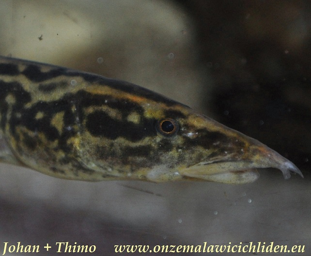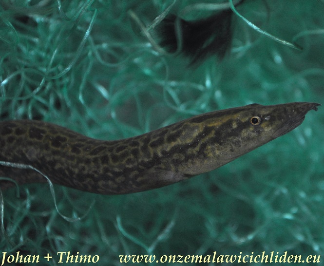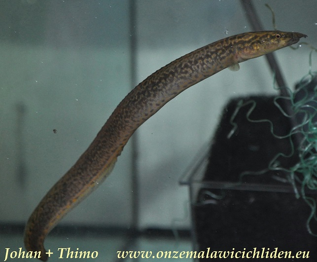 Aethiomastacembelus shiranus mainly is living in sandy environments on places with a low water level. Sometimes you can also find them in rocky environments. They can be found in entire Lake Malawi. When you want to keep these animals you need to give them a really large aquarium because of the size it reaches (in the lake this species can grow to about 30 cm). It's also necessary to cover this tank, it seems that they sometimes want to leave their environment. In general they are tolerant against other large inhabitants. Probably they are feeding themselves with invertebrates and little fish. ![]() |